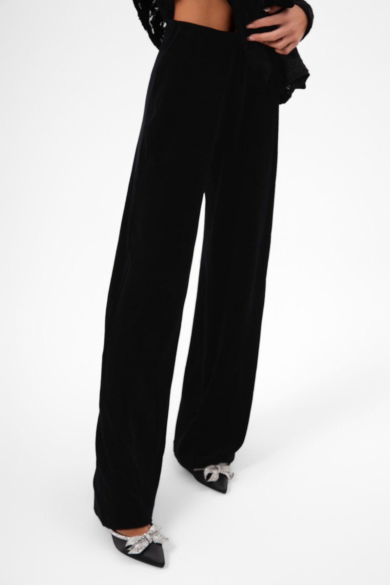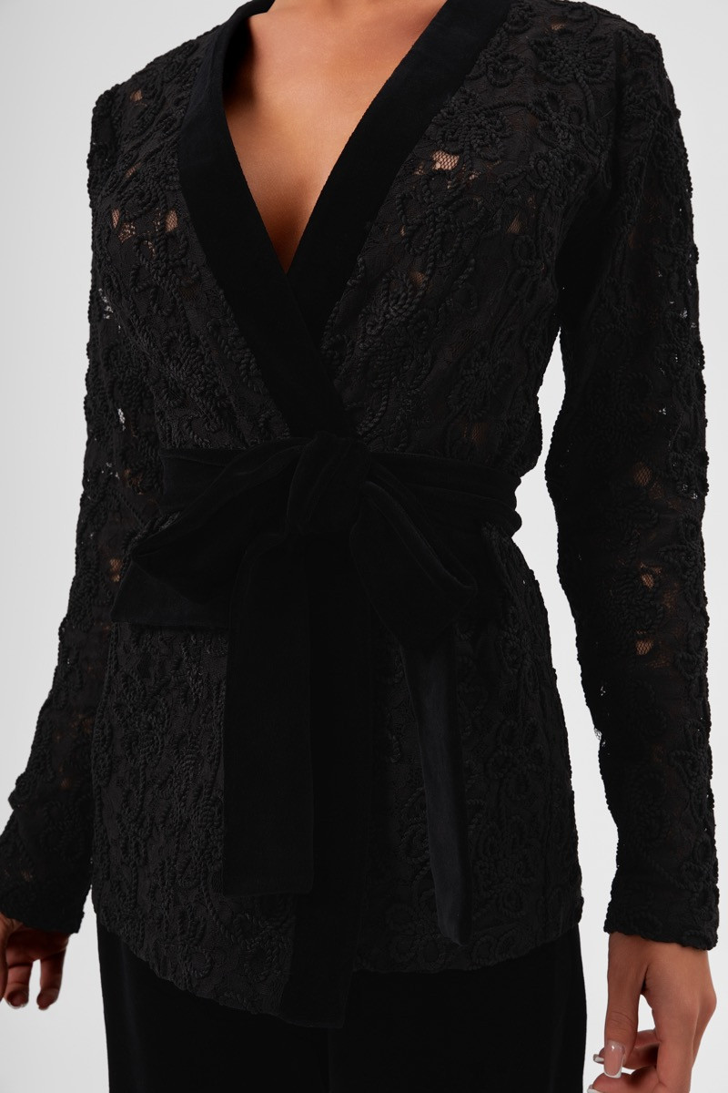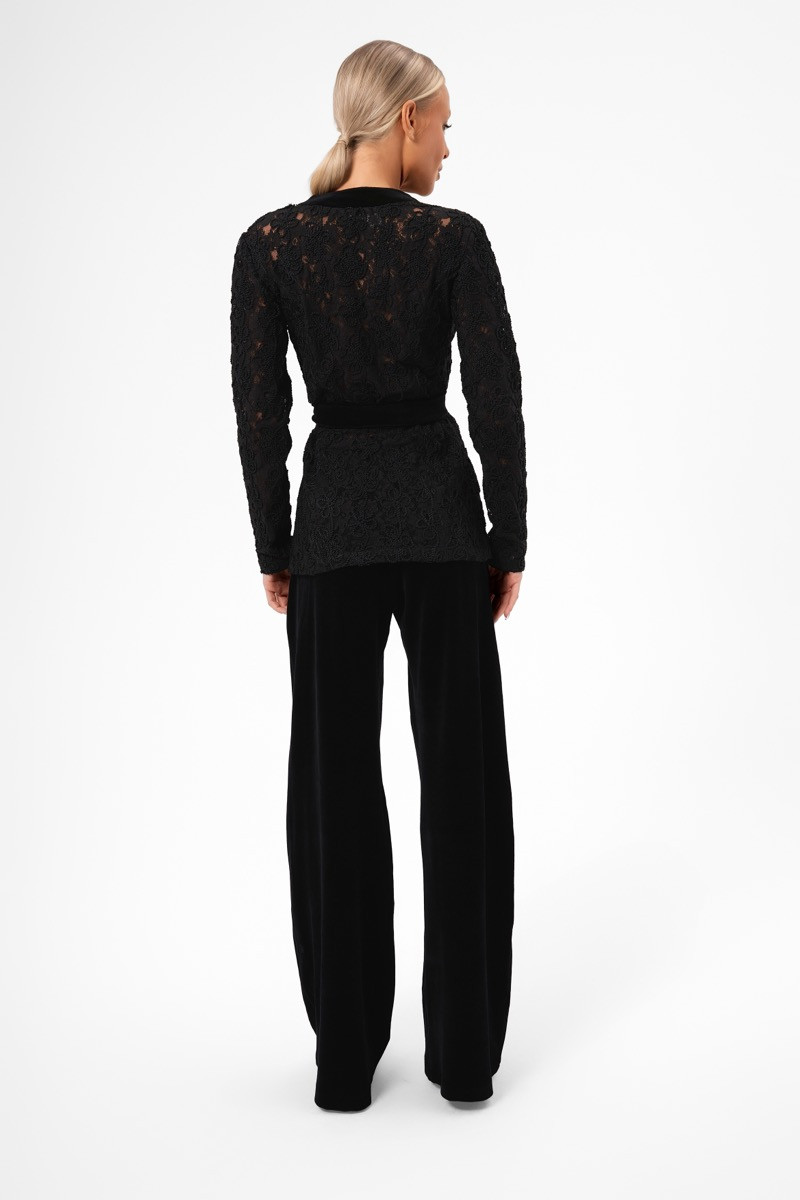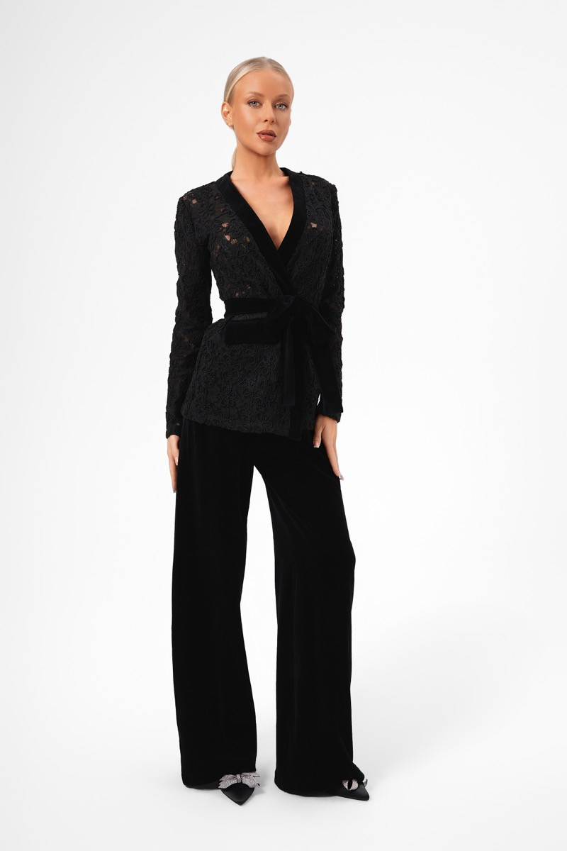 Сако с панталон кадифе е изискан комплект, който съчетава два луксозни материала – дантела и кадифе – в един стилен силует. Сакото е изработено от богата релефна дантела, подчернена с кадифени кантове и акценти. Дълбокото прехлупване отпред завършва с широка кадифена колан–панделка, която оформя талията и придава елегантна женственост. Панталонът е прав, изцяло от меко кадифе, което пада красиво и издължава силуета.Комбинация, която съчетава класа, финес и модерен прочит — идеална за вечерни събития, коктейли и специални поводи.