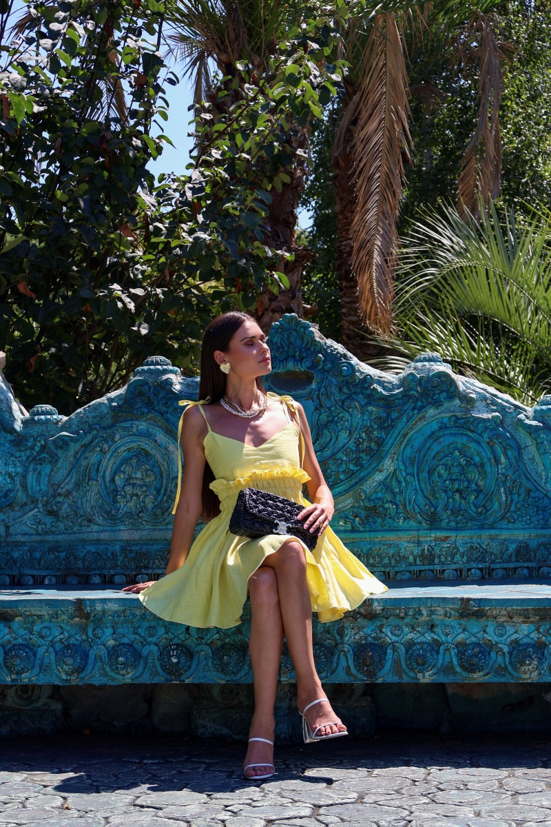 Рокля Yellow Iris  е изработена от 100% висококачесвен лен и се предлага с два варианта на презрамки. Разкроена долна част с асиметрична дължина и воланена линия. Комбинирай с високи или ниски сандали и бижута в златни тонове за завършен стил.