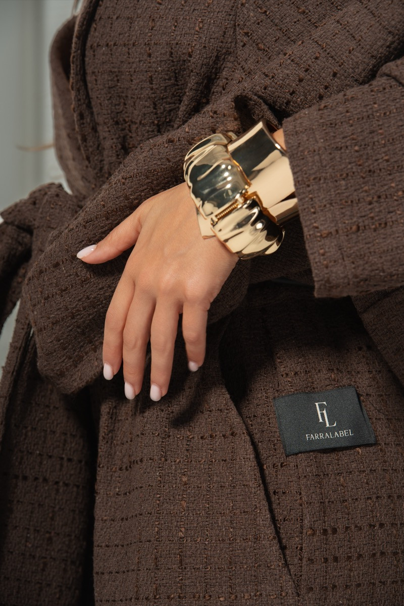 Комплектът е изработен от луксозно букле в наситен шоколадов цвят, което придава богата текстура и усещане за топлина и уют.